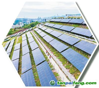 重庆市长寿区鼓励企业利用荒山荒坡、厂房屋顶等空间,发展光伏发电产业项目。图为4月1日,在当地一家公司周围边坡,国家电网重庆长寿供电公司员工在巡检光伏发电设备。