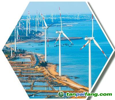 4月4日,广东省湛江市徐闻县角尾乡南极村海边,数十座白色风力发电机组源源不断输送