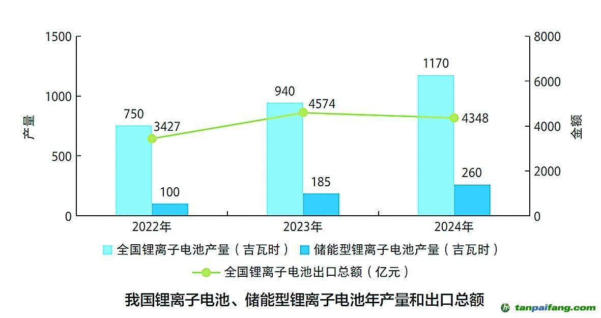 新型储能产量保持增长态势。2024年全国锂离子电池产量持续攀升,总产量达11.7亿千瓦时,同比增长24%,行业总产值超过1.2万亿元,其中,储能型锂离子电池产量达到2.6亿千瓦时,占全国锂离子电池产量22%,连续3年提升。 本+文`内/容/来/自:中-国-碳-排-放-网-tan pai fang . com