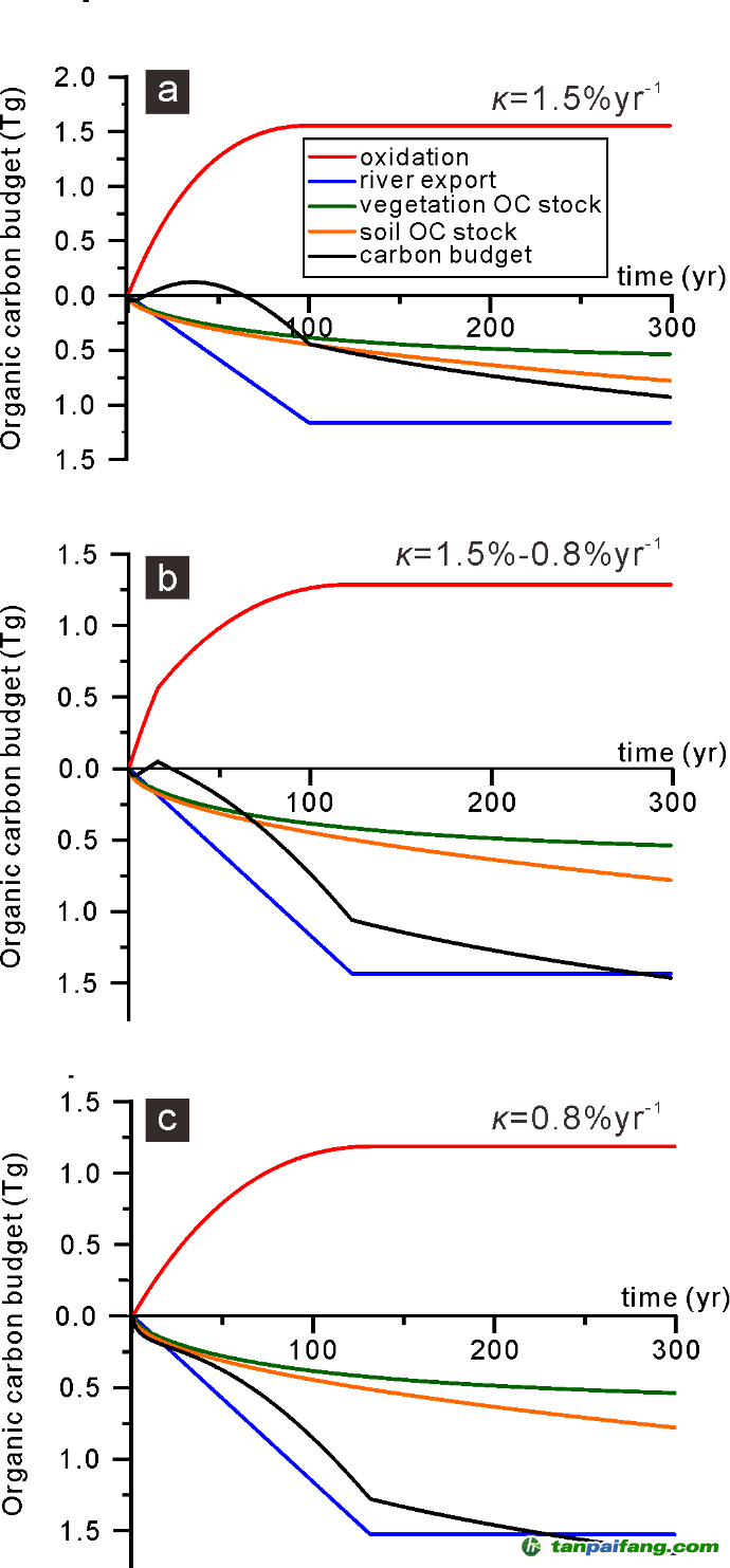 最后,该研究团队构建了震后区域碳收支演化模型。结果显示,尽管强震在瞬时造成巨大生态破坏,但随之而来的植被再生、土壤碳库恢复与颗粒有机碳沉积埋藏能够在数十年尺度上逐步抵消初期有机碳氧化,推动滑坡区碳收支向碳汇方向转变。这一发现表明,强震后有机碳的氧化、河流搬运埋藏以及生态系统恢复共同构成了一个长期演化过程,生态恢复在调节极端事件之后碳循环中发挥着不可忽视的作用。 內.容.來.自:中`國*碳-排*放*交*易^網 t a npai fa ng.com