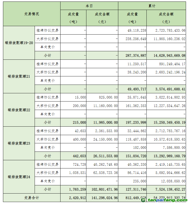截至今日,全国碳排放权交易市场累计成交总量812,449,068吨,累计成交总额54,270,912,332.74元。 夲呅內傛莱源亍:ф啯碳*排*放^鲛*易-網 τā ńpāīfāńɡ.cōm