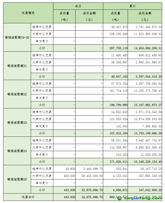 截至今日,全国碳排放权交易市场累计成交总量869,998,518吨,累计成交总额58,047,505,209.77元。