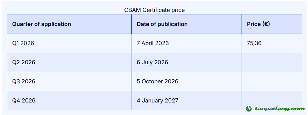 4月7日,欧盟委员会税务与海关同盟总司在碳边境调节机制(CBAM,又称“碳关税”)专页网站上公布了首个CBAM证书价格——75.36欧元。这个价格是基于2026年一季度欧盟碳市场(EU ETS)的配额拍卖平均价格。