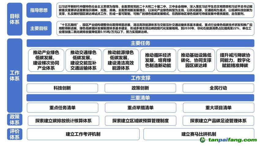 以习近平新时代中国特色社会主义思想为指导,全面贯彻党的二十大和二十届二中、三中、四中全会精神,深入落实习近平生态文明思想和习近平总书记视察重庆重要讲话重要指示精神,完整准确全面贯彻新发展理念,以深化产业绿色转型为主线,以优化能源、交通结构为重点,以低碳科技创新为支撑,扎实做好园区碳达峰试点工作。“十五五”期间,园区产业结构调整优化取得明显进展,清洁高效能源体系与交能互补交通运输体系基本建成,重点行业绿色低碳技术研发和推广应用取得新进展,绿色低碳循环发展体系基本健全,形成多维支撑达峰的现代化发展格局。到2030年,非化石能源消费占比提高至22%,单位工业增加值二氧化碳排放量降低至0.95吨/万元以下,努力实现碳达峰。 本`文内.容.来.自:中`国`碳`排*放*交*易^网 t a npai fan g.com