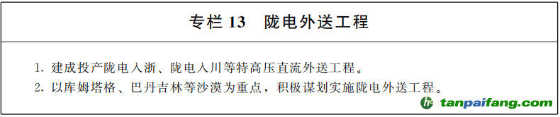 (三)加快建设大容量通道,提升陇电外送能力。建成陇电入浙、陇电入川等特高压直流输电工程,持续扩大陇电外送能力。积极推动库姆塔格、巴丹吉林二回等后续直流工程纳入国家规划并适时启动建设。持续推动国家沙戈荒大基地新能源项目建设,提高输电通道新能源电量占比,持续深化纯清洁能源特高压外送通道项目研究。(省能源局、国网甘肃省电力公司按职责分工负责) 本`文内.容.来.自:中`国`碳`排*放*交*易^网 t a npai fan g.com