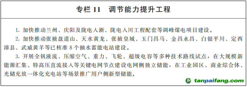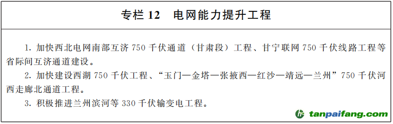 (二)加强输配电网建设,提升接入送出能力。加强省际间交流输电通道联络,提升甘肃与陕西、青海、宁夏、新疆等省份电力互济能力。强化省内750千伏骨干网架,加快推进河西走廊北通道建设,力争2030年前投运。重点围绕城市、工业园区等负荷中心,完善330千伏电网规划布局。加强配电网统筹规划,加快推动一批配电网建设改造,提升配电网安全可靠供电和应对极端灾害能力,满足分布式新能源和电动汽车充电设施等大规模发展需求。(省能源局、国网甘肃省电力公司按职责分工负责) 本+文内.容.来.自:中`国`碳`排*放*交*易^网 ta np ai fan g.com