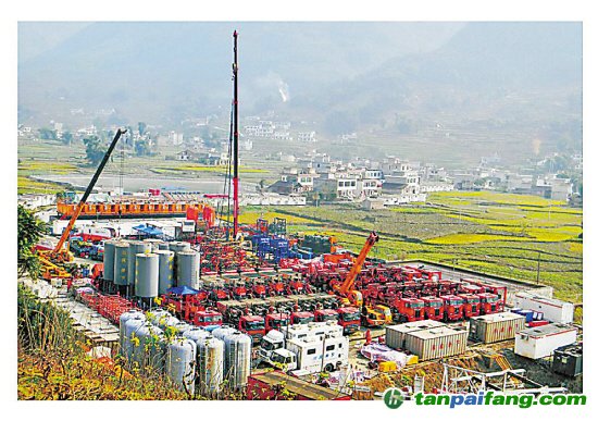 图为长宁页岩气水平井组“拉链式”压裂现场。