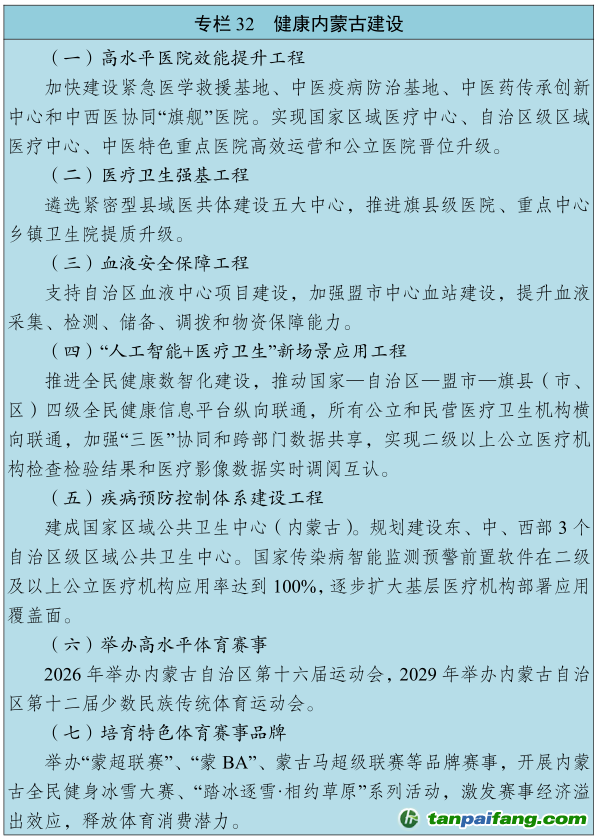 优化医疗机构功能定位和布局,完善分级诊疗体系,构建“一体两翼”医疗发展新格局,促进优质医疗资源扩容下沉和区域均衡布局。统筹推进国家、自治区区域医疗中心建设,推动与共建医院同质发展。深化紧密型城市医疗集团建设。做实医疗卫生强基工程,加强旗县(市、区)和基层医疗机构运行保障。推进紧密型县域医共体建设,基本实现县域医共体全覆盖。完善固定与流动相结合的农村牧区医疗卫生服务体系。提高家庭医生服务覆盖率,提升基层医疗卫生机构诊疗量占比,丰富药品品种配备。深入开展中医药(蒙医药)健康促进行动,分层分级推进中医(蒙医)优势专科建设,促进旗县级中医(蒙医)医院高质量发展。加强全科医生、执业医师和护士队伍建设,提高住院医师规范化培训水平。推进医院病房改造和医疗设备更新。大力发展“互联网+医疗健康”。 本+文+内.容.来.自:中`国`碳`排*放*交*易^网 t a np ai fan g.com