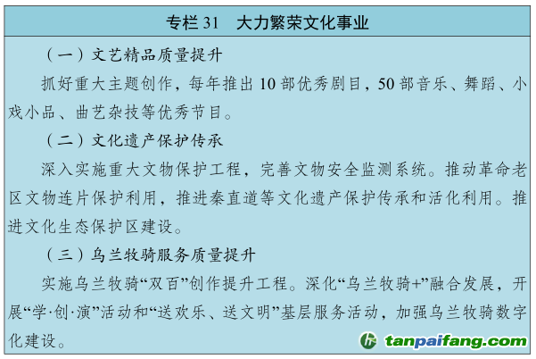 坚持以人民为中心的创作导向,提升文化原创能力,营造良好文化生态。鼓励和扶持艺术创作创新,实施文艺精品创作工程、新时代内蒙古文学攀登工程、新时代舞台艺术创作工程、文旅融合演艺产品孵化工程,改进文艺创作生产服务,推动新闻出版、广播影视、文学艺术等领域创作生产出更多人民群众喜闻乐见的精品力作。加强和改进文艺理论和评论工作。实施文艺领军人才和优秀人才团队扶持计划,培育形成结构合理、锐意创新的高水平文化人才队伍。 本`文内.容.来.自:中`国`碳`排*放*交*易^网 t a npai fan g.com