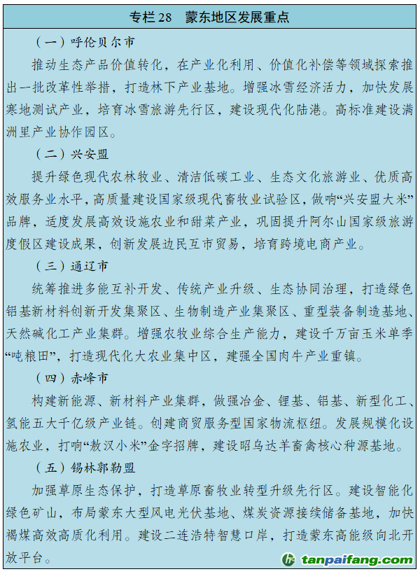 立足维护国家“五大安全”,推动蒙东地区振兴实现新突破,巩固生态优势,做成农牧业大产业,发展现代能源经济,培育特色工业体系,发展泛口岸经济,加快补齐基础设施短板。推出特色四季旅游产品,大力发展冰雪经济。推进高标准农田建设,实施大面积粮食单产提升行动,促进畜牧业增产增效。优化能源资源开发利用方式,提升蒙东煤炭资源接续能力和自给能力,统筹优势矿种开发和全产业链发展。完善“口岸+腹地”联动发展机制,开展进口资源落地加工。
